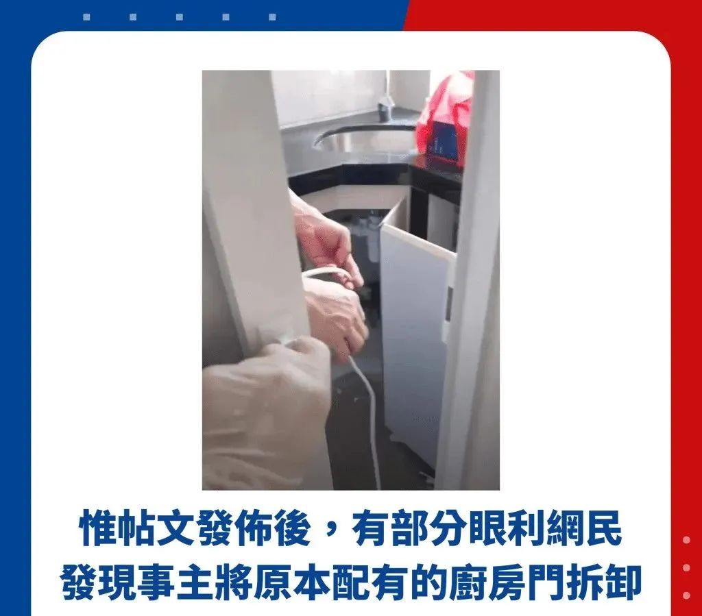惟帖文发佈后,有部分眼利网民发现事主将原本配有的厨房门拆卸,改装成趟摺门,违反了房屋署有关“业主固定装置分类”的指引(房屋署指引及违例原因详见上文图辑),更呼吁集体去信房屋署,以举报事主的违例改建。