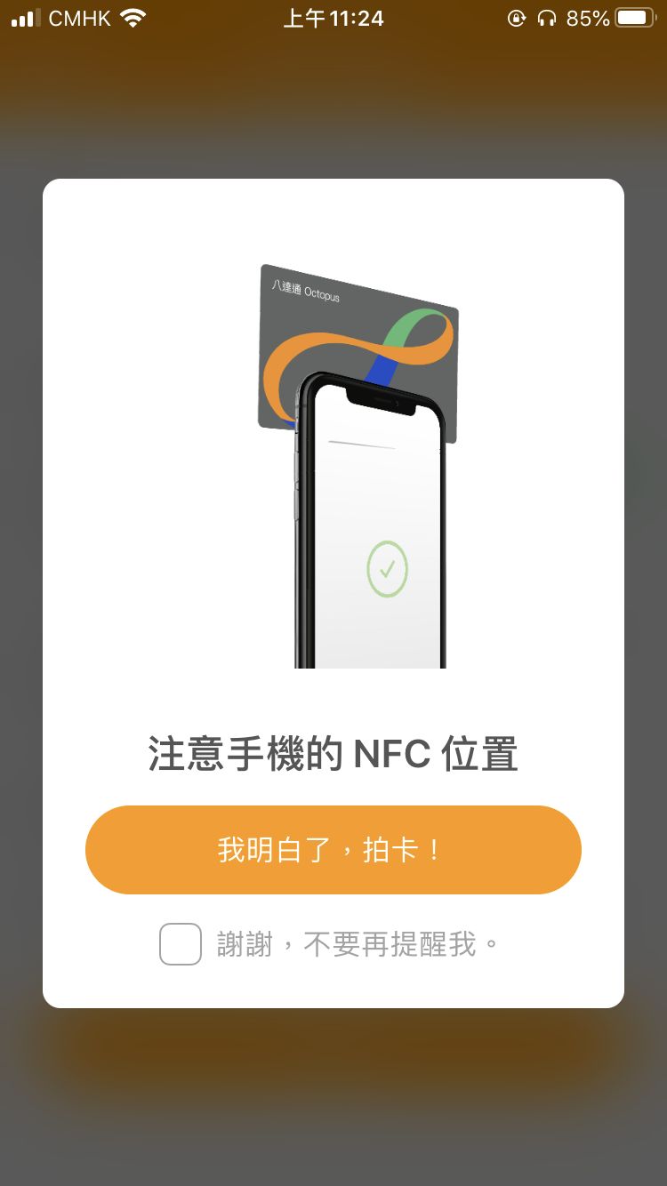 9⃣️拍卡,将八达通放到手机背部上方。让手机读取八达通信息。