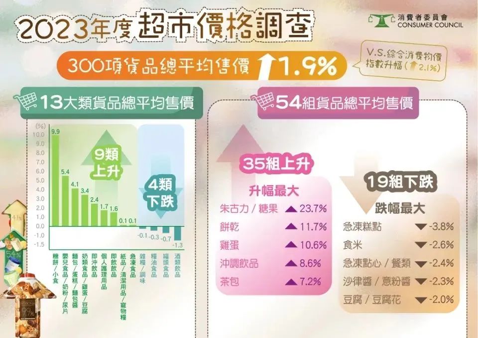 这13类货品的总平均售价较2022年上升了1.9%,当中“糖饼/小食”类的升幅最大,达到9.9%;其次是“婴儿食品/奶粉/尿片”类升幅5.4%、“面包/蛋糕/面包酱”类升幅4.1%、“奶类食品/鸡蛋/豆腐”类升幅3.4%和“即冲饮品”类升幅2.4%。