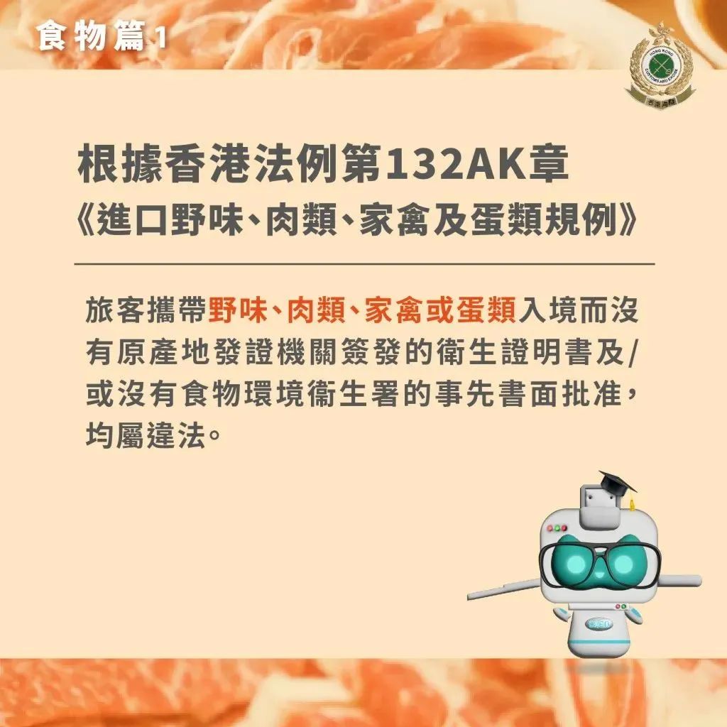 根据《进口野味、肉类、家禽及蛋类规例》(第132AK章),凡任何人携带野味、肉类、家禽或蛋类入境而没有来源地发证实体签发的卫生证明书及/或没有食环署的事先书面批准,均属违法。违例者一经定罪,可被罚款港币五万元及监禁六个月。