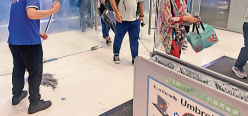首阶段“走塑”法例生效后,商场普遍不再提供塑胶雨伞袋,改为放置除水器,昨日(26日)黄色暴雨生效逾5小时,不少市民持湿伞入商场,滴水问题持续扰民。记者走访多个商场,见到雨伞除水器几乎无人使用,不少人站在门口甩乾雨伞,或直接入商场。有市民反映,使用除水器后,觉得雨伞有异味。有市民认为,除水器不能让雨伞乾爽,不派塑胶雨伞袋对商场或造成“麻烦”。