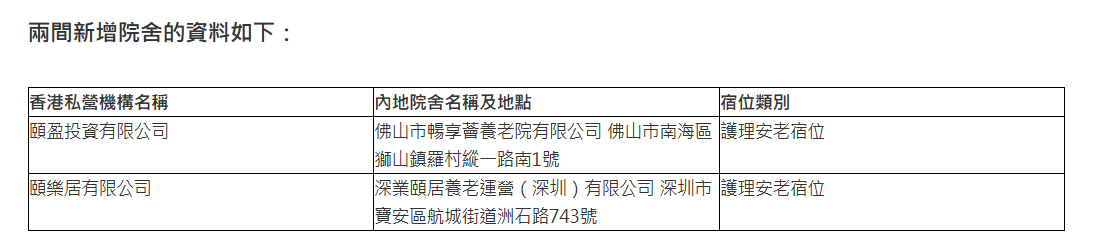 “广东院舍照顾服务计划”的安老院增加,有助丰富长者的内地安老选择。社会福利署(社署)今日(2日)宣布,“广东院舍照顾服务计划”由5月6日起新增两间分别位于佛山和深圳的安老院为认可服务机构。两间院舍均由具有在香港提供资助安老院舍照顾服务经验而纪录良好的香港私营机构及内地养老机构合作营运。