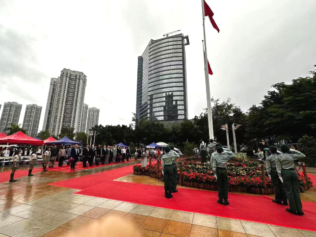 中央政府驻港联络办新界工作部副处长庞杰钊、全国人大代表沉豪杰、全国政协委员梁志祥和吕坚、立法会议员刘国勳、元朗民政事务助理专员高倬炜、元朗各界协会主席李月民、中华全国青年联合会兼元创青年监事长陈晓锋、元朗区各政府部门首长、元朗区议员及元朗区“三会”成员,以及12间元朗区中小幼校长、师生和家长合共约300人一同出席升旗礼。活动由民政事务总署社区参与计划及恆香老饼家有限公司王伟樑赞助。