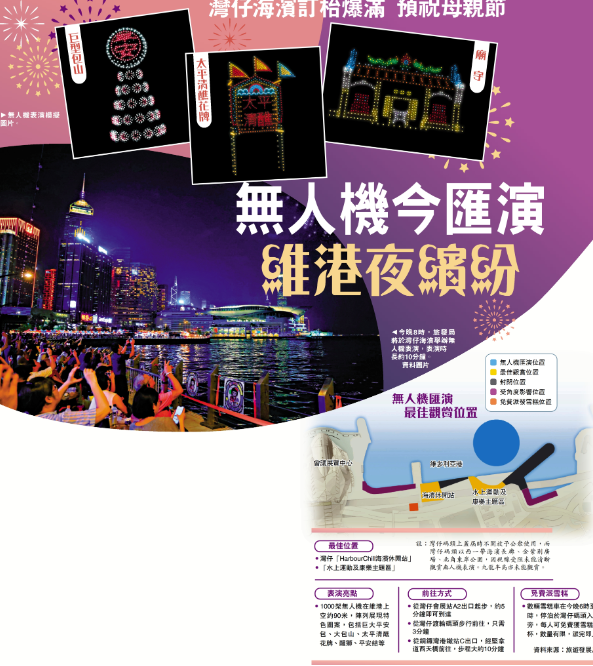 黄金周5月1日烟火表演大受游客欢迎,吸客见成效,旅发局今晚(11日)8时在维港再有无人机表演,届时将展现佛诞、太平清醮两大节庆等特色图案。 旅发局表示,最佳观赏位置在湾仔码头旁,届时将有免费雪糕派发,无人机表演料引来大批市民及游客观看。 有酒楼、中餐厅表示,该表演时段订枱已爆满。