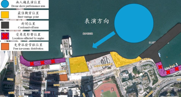 旅发局表示,无人机表演等最佳观赏位置为湾仔HarbourChill海滨休闲站及水上运动及康乐主题区。 湾仔码头上盖届时不开放予公众使用,而湾仔码头以西一带海滨长廊、金紫荆广场等其他湾仔海滨位置,因视线受阻未能清晰观赏无人机表演,九龙半岛亦未能观赏。 旅发局将安排数辆雪糕车在晚上6时至8时停泊于湾仔码头入口旁免费派发雪糕,每人可获雪糕一杯,数量有限,派完即止。