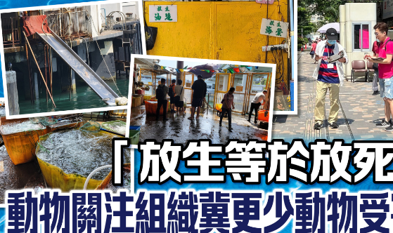 昨日早上北角码头人头涌涌,不少善信在海鲜档买完海产后,对着放生的海产品口诵经文祈福后,海产品放落特备的滑梯瀡到海中。香港两栖及爬虫协会干事到北角码头视察,到场后尝试劝阻市民停止放生,但唔成功,好多动物一落海,就已经被雀捉走。他们亦教育附近市民,宣扬爱护动物意识,希望以后更少动物受害。