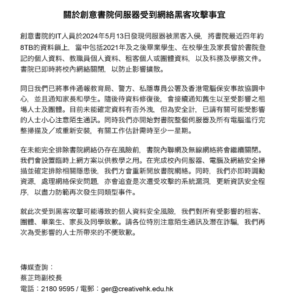 香港兆基创意书院今日(18日)发布通告指,本月13日发现伺服器被黑客入侵,最近四年约8TB的资料被锁上,包括2021年及之后毕业生、在校学生及家长曾在书院登记的个人资料、教职员个人资料、租客个人或团体资料,以及科务及学务文件,目前未能确定资料有否外泄。