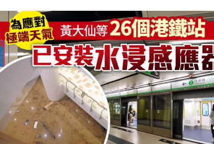 为应对极端天气,港铁今年在26个港铁站总计42个出入口安装了水浸感应器。其中,九龙塘安装6个,佔最多;其次是去年因特大暴雨水浸严重的黄大仙站,有3个出入口已安装水浸感应器。