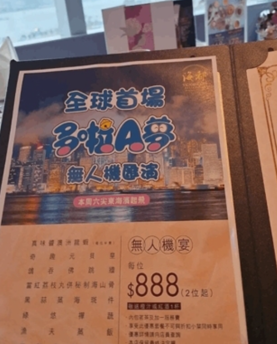有网民在FaceBook群组“香港茶餐厅及美食关注组”发帖,指有“去金钟海都饮茶先知有呢样嘢今期兴玩多啦A梦”。从其上传的图片显示,该单张印上“全球首场多啦A梦无人机汇演”,标明为“无人机宴”,菜单包括龙虾和佛跳牆等,每位收费888元,至少2位起。