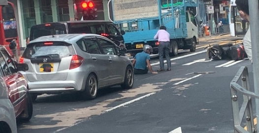 今日早上约7时54分,一辆电单车沿亚皆老街中线往大角咀方向行驶至近弥敦道交界口前,一辆白色私家车由快线切向中线,其间两车发生碰撞。电单车上南亚裔男司机和男乘客倒地受伤,幸两人清醒。事故原因有待调查。