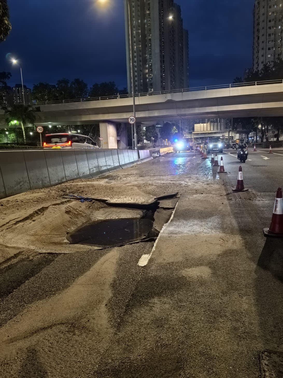 南区区议员张伟楠在社交平台表示,事发地点因地下咸水管爆裂引致路面下陷,部分行车线需封闭以进行抢修工程,预计会对明早繁忙时间交通造成相当程度影响。他呼吁需途经上址居民预早规划行程,驾驶人士请遵照现场警员或临时交通标志指示,小心驾驶。