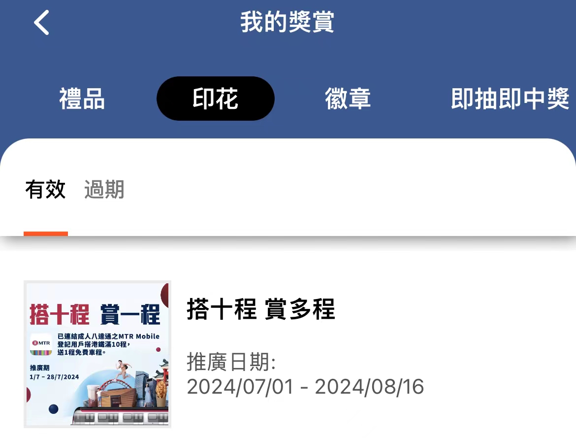 印花卡可在MTR Mobile账户内查询,“我的奖赏”内“印花——有效”页。印花会在乘车日后,3日之内加入到印花卡内。储齐10个印花之后,就要在8月16日或之前按“立即换领”,获取一程免费本地单程,逾期作废。若成功换领后,须于2025年1月2日或之前使用车程。