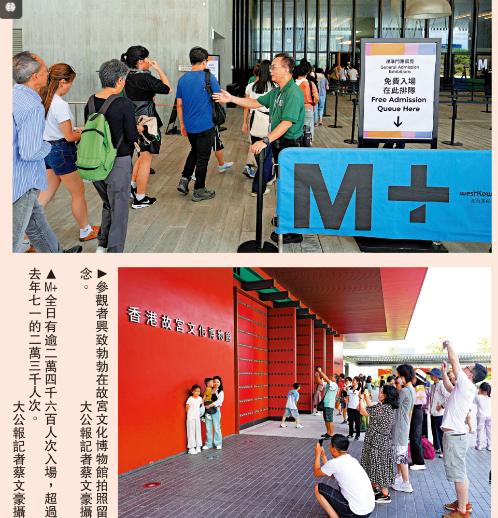 为庆祝香港回归祖国27周年,M+及香港故宫文化博物馆的标准门票展览昨日免费向市民开放,受到市民热烈欢迎。M+全日有超过24600人次入场,超越去年七一的23000人次;香港故宫文化博物馆则有近6400人次入场。
