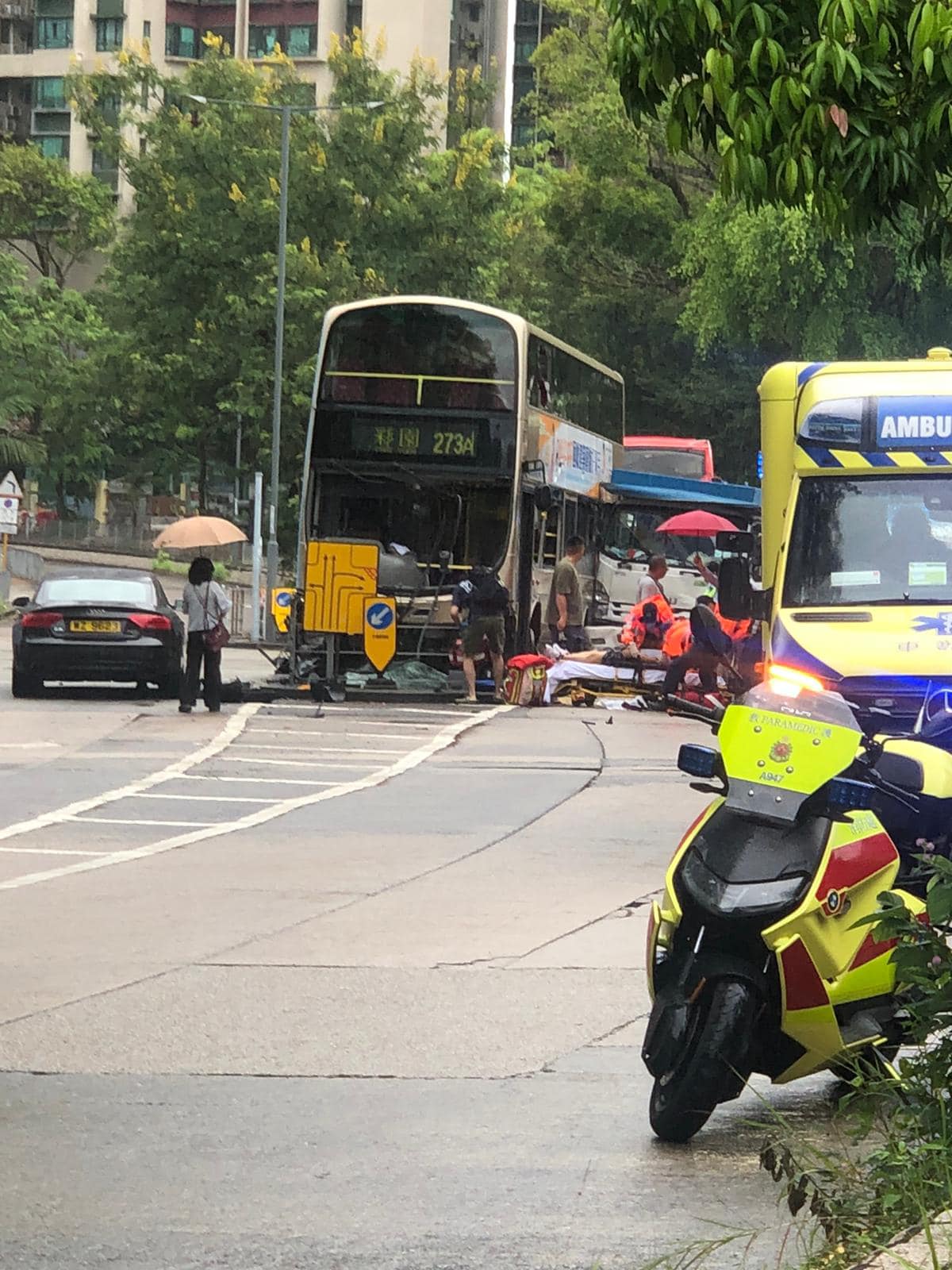 巴士剷上安全岛,多部救护车赶到现场。(FB图片)