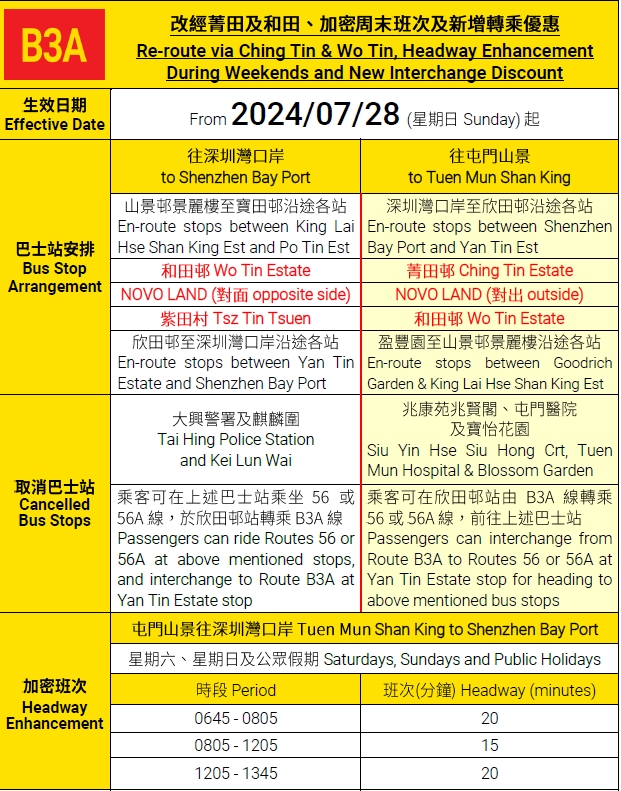 由7月28日起,B3A号线来回方向的班次更改行车路线,行经兴贵街、欣宝路及紫田路,为屯门北居民提供直接往返深圳湾口岸的服务。更改路线后,由山景邨开出的班次将取消原有大兴警署及麒麟围的巴士站,并于和田邨、NOVO LAND及紫田村增设巴士站。由深圳湾口岸开出的班次则取消兆康苑兆贤阁、屯门医院及宝怡花园的巴士站,并于菁田邨、NOVO LAND及和田邨增设巴士站。B3A号线同日起,亦会加密周末上午繁忙时间往深圳湾口岸方向的班次。
