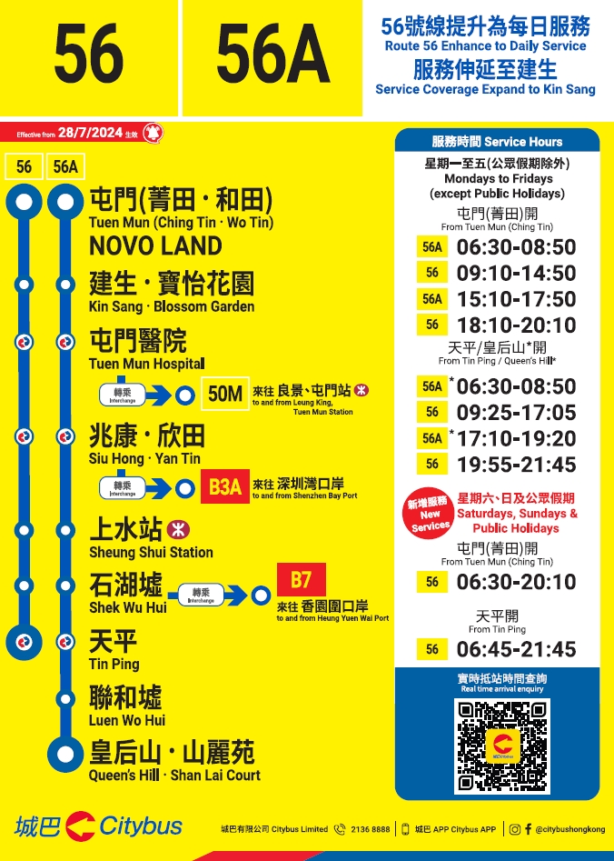由7月28日起,56号线增设星期六、日及公众假期服务,来回方向班次均为每20至30分钟一班,联同56A号线将提供每日往来屯门及上水/皇后山的服务,并会延长服务时间及加密班次。56/56A号线与B3A号线将增设转乘优惠,便利顾客由北区到屯门转乘B3A号线前往深圳湾口岸。56/56A号线亦设有与B7号线的转乘优惠,让屯门北居民前往香园围口岸。此外,56及56A号线来回方向的行车路线亦于同日起改经震寰路。由菁田邨开出的班次取消原有于NOVO LAND对面及紫田村的巴士站,并于NOVO LAND外、大兴警署及麒麟围增设巴士站。由上水(天平邨)/皇后山开出的班次则取消于NOVO LAND外的巴士站,并于兆康苑兆贤阁、屯门医院、宝怡花园及NOVO LAND对面增设巴士站。