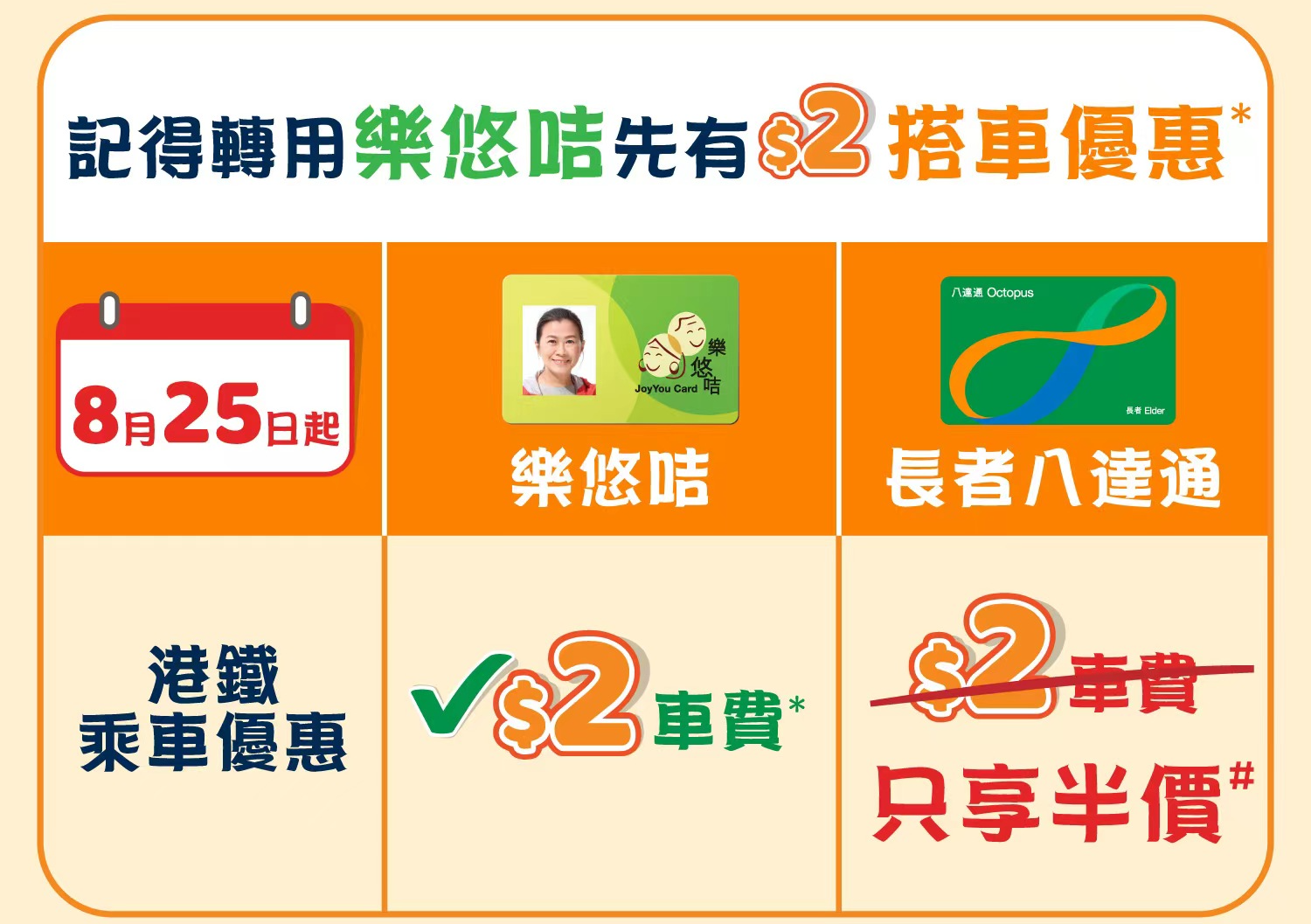 港铁公司与八达通卡有限公司昨日(19日)表示,政府长者及合资格残疾人士公共交通票价优惠计划(“二元优惠计划”)将于8月25日起实施新安排,所有六十岁或以上香港居民必须使用“乐悠咭”才能享用二元优惠计划。在新规定下,乘客届时如继续使用现时的“不记名长者八达通”或“长者个人八达通”乘搭港铁,优惠只有由港铁提供的约成人车费半价,并不能获得二元乘车优惠。