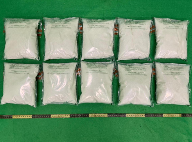 一名21岁男旅客昨日从法国巴黎经泰国曼谷飞抵本港。进行清关时,海关人员发现该名男子寄舱行李里面物品形态相近且密度平均。关员感到可疑遂深入调查,最终在该名男子行李中检获10件包装为“豆浆粉”的同款物品。透过毒品快速测试,确认里面物品为氯胺酮。