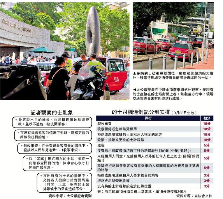 为打击的士业内的害群之马,提升整体的士服务质素,政府下月实施的士司机违例记分制,并引入优质的士车队,最快下月起有首批车队投入服务。不过,大公报记者近日以游客身份,在多个地点实测发现的士业依然乱象多多。有的士司机公然兜路,提供电子支付但以人民币1:1折算港币,一程车费多收近40港元车资;有的士司机公然拒载,且态度恶劣地表明只做“过海客”,着令乘客“不过海的那边排队,去去去!”有的士司机在的士站拣客,听到满意的目的地,才打开车门让乘客登车。