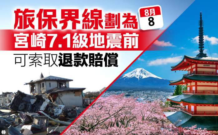 鉴于最近日本宫崎县对开海域发生7.1级地震后,日本当局向日本部分地区发出巨大地震预警,特区政府昨日(12日)提醒身在日本或计划前赴日本的港人要提高警惕,部分地区酒店及旅馆出现退订潮。对于受地震影响而提早结束行程或行程延误的旅保赔偿,香港保险业联会行政总监刘佩玲在电台节目表示,旅游保险保障的界线划在8月8日宫崎县发生7.1级地震。