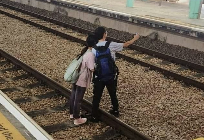 照片可见,一对背着背囊的男女闯入轻铁兆康站两月台之间的路轨,男子右手疑似举手机自拍,女子则紧靠男子,疑似望向手机方向一同自拍。照片中天色较暗,且月台人流量较小,怀疑两人是在深夜走进路轨。