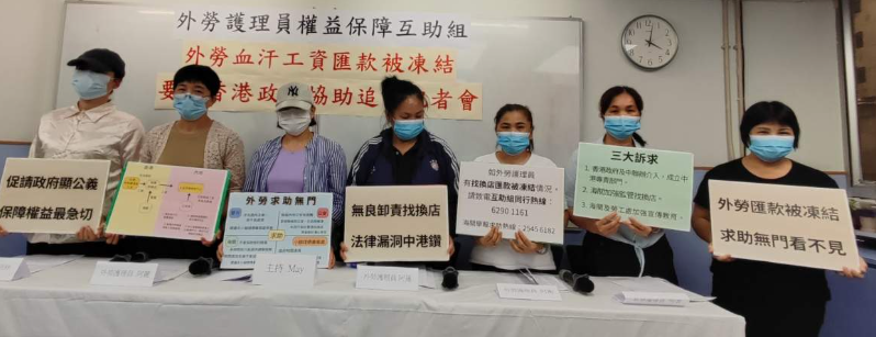 外劳护理员权益保障互助组今日(23日)召开记者会,揭露外劳工资经找换店汇款被冻结却求助无门的苦况。外劳透过在港持牌找换店汇款回乡,不但没有成功汇款给家人,反而被怀疑汇款是洗黑钱而惹上官非。外劳期盼政府介入跟进。