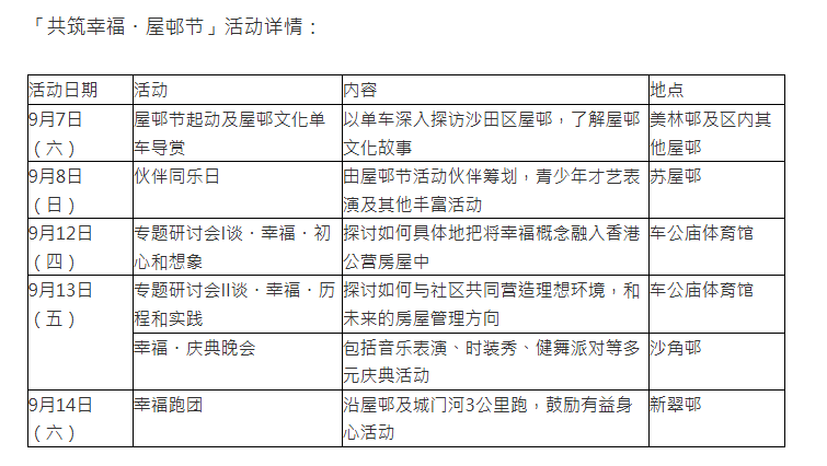 为推广指引中的幸福设计概念及增强社区的凝聚力,房屋局和房委会将于9月7日至15日举行“共筑幸福屋邨节”,活动包括屋邨文化单车导赏、社区艺术创作及专题研讨会等。 整套《幸福设计》指引亦会于9月12日的专题研讨会中发布。