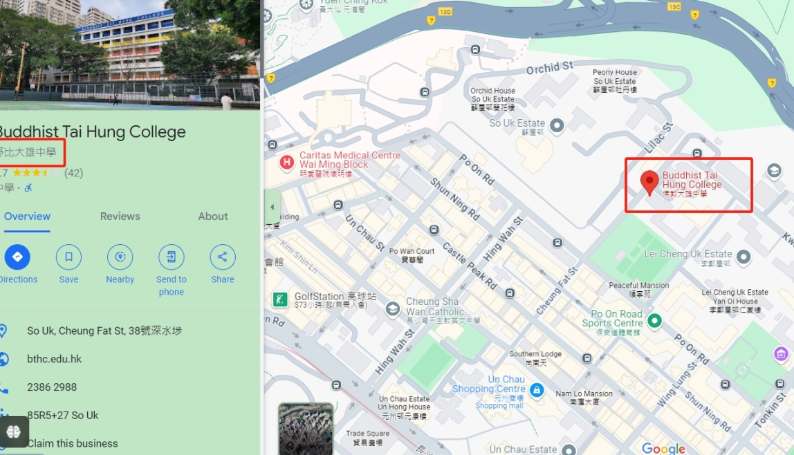 据悉,部分引用Google地图的手机应用程式,包括Uber、九巴等,在搜寻相关学校地址时,会显示遭恶搞的校名。点新闻记者今晚10时许使用Google地图搜索佛教大雄中学,中文名称仍错误显示为“野比大雄中学”。
