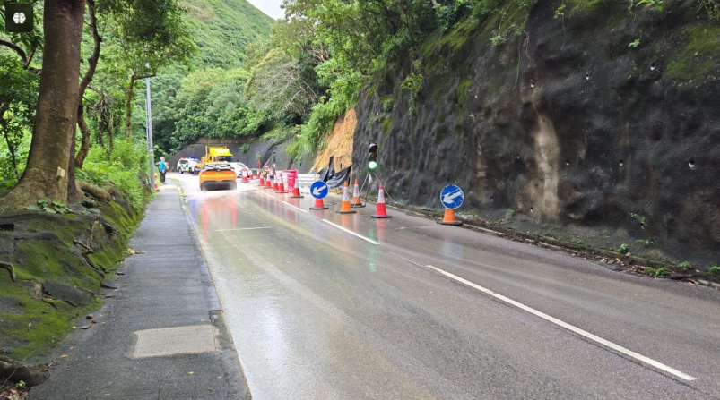 现上址实行单线双程措施。(路政署fb)路政署指,其接获报告后随即派员到场跟进,但清理期间再有山泥塌下,在场人员一度须撤离。随后土力工程处人员到场视察,承建商通宵完成初步抢修工作。路政署会持续监察现场情况,并会继续进行馀下的斜坡巩固工程,期望能尽早重开受影响路段的所有行车线。
