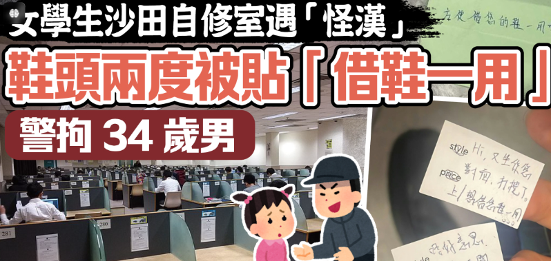 女学生沙田自修室遇“怪汉” 鞋头两度被贴“借鞋一用” 警拘34岁男