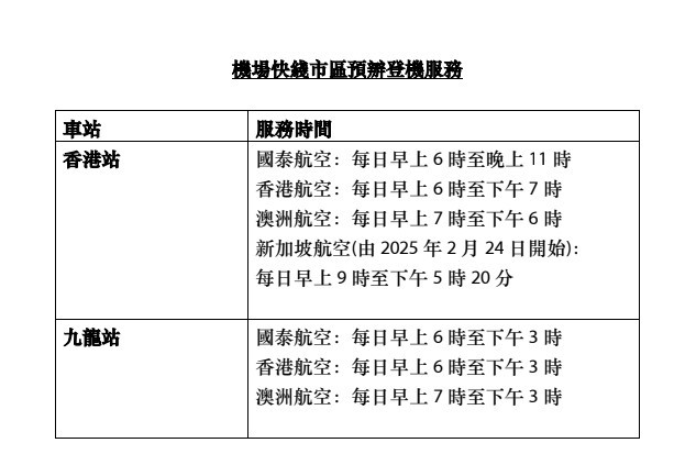 港铁指出,市区预办登机服务是港铁为机场快綫旅客提供的专属登机和行李託运安排,并由各航空公司提供服务。澳洲航空亦已于本月上旬进驻香港站及九龙站,连同原有的国泰航空及香港航空,将有4间航空公司提供市区预办登机服务。港铁称,会继续进行协调,欢迎更多航空公司加入为乘客提供市区预办登机服务,进一步便利旅客出行。