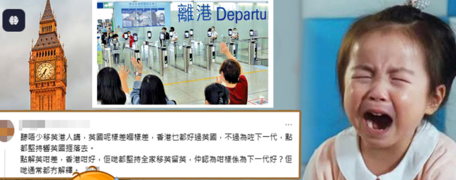 该名移英港人在社交平台threads发文表示,「听唔少移英港人讲,英国呢样差、嗰样差,香港乜都好过英国,不过为咗下一代,点都坚持响英国捱落去。」楼主质疑「点解英咁差,香港咁好,佢哋都坚持全家移英留英,仲认为咁样系为下一代好?」然而,一众移英家长却又说不出个所以然,「佢哋通常都冇解释。 」