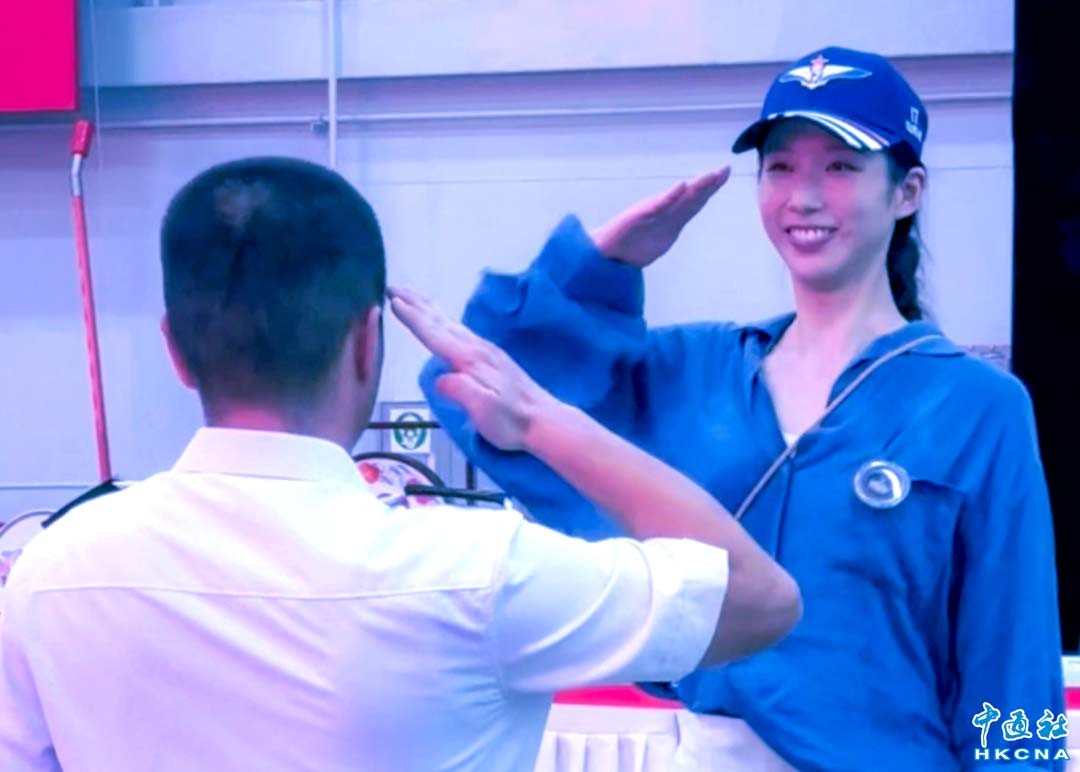 7月6日,巴黎奧運女子重劍金牌得主江旻憓登上山東艦參觀,並向軍人敬禮致敬。(付鈺 攝)