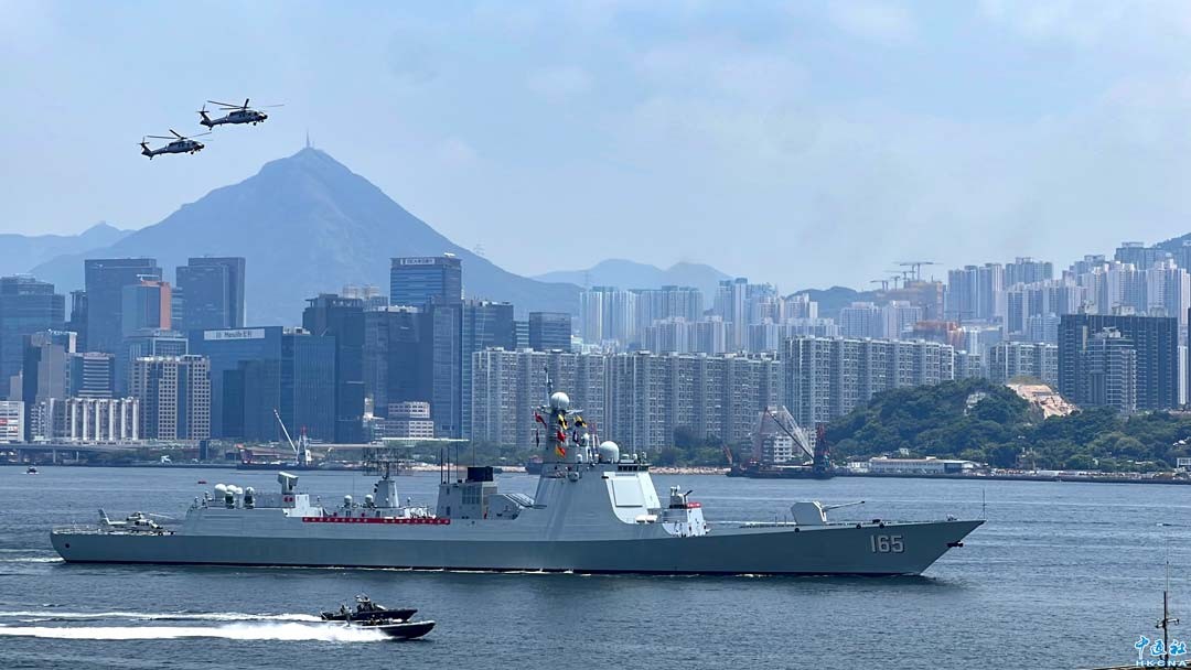 7月3日上午,山東艦航母編隊抵達香港。圖為萬噸大驅”延安艦”(舷號106)進入香港水域。(蔡志東 攝)