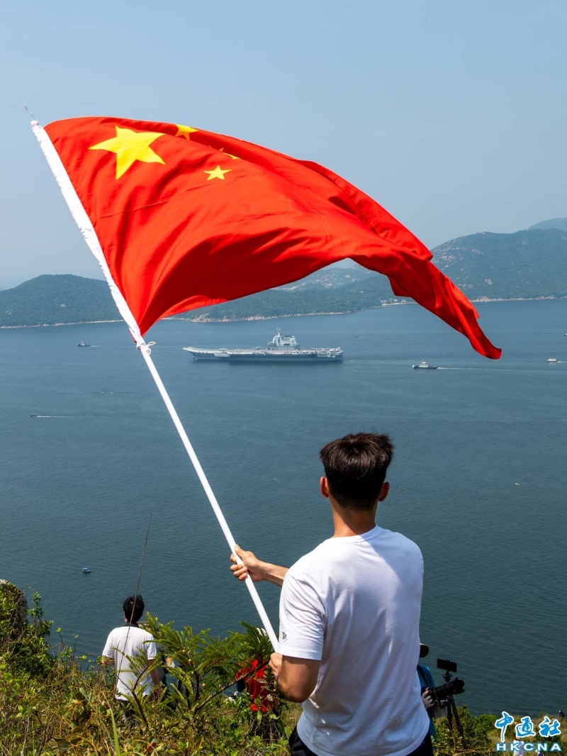 7月6日,山東艦航母編隊结束訪問香港行程,市民站在玉桂山山頂揮舞國旗送别,山東艦鳴笛回應。(蔡志東 攝)