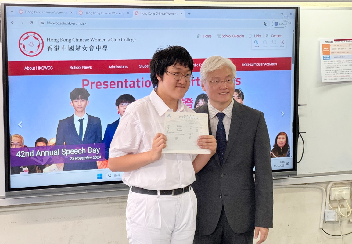 香港中學文憑試 DSE 放榜日,中國婦女會中學男考生王海博(右)成為”終極狀元”,他在中英數 3 科、數學科延伸部份(俗稱 M1 及 M2)、以及另外 4 科選修科都獲得 5** 成績。