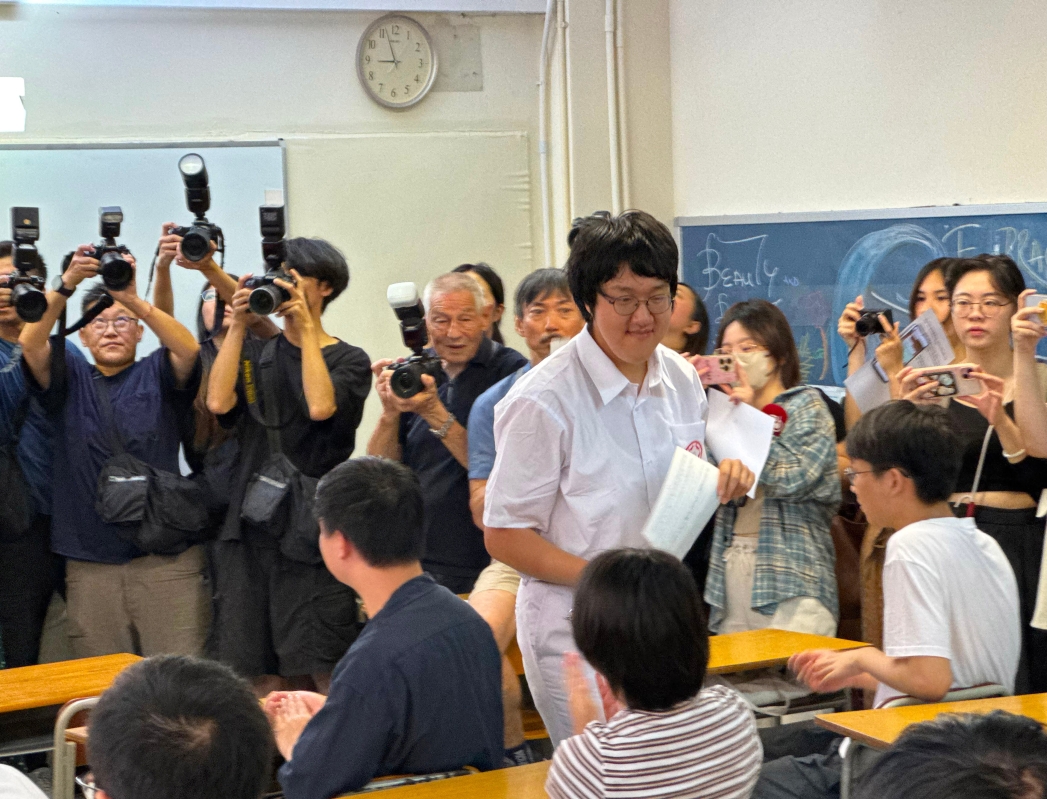 香港中學文憑試 DSE 放榜日,中國婦女會中學男考生王海博(右)成為”終極狀元”,他在中英數 3 科、數學科延伸部份(俗稱 M1 及 M2)、以及另外 4 科選修科都獲得 5** 成績。(中通社記者 朱樂怡  攝)