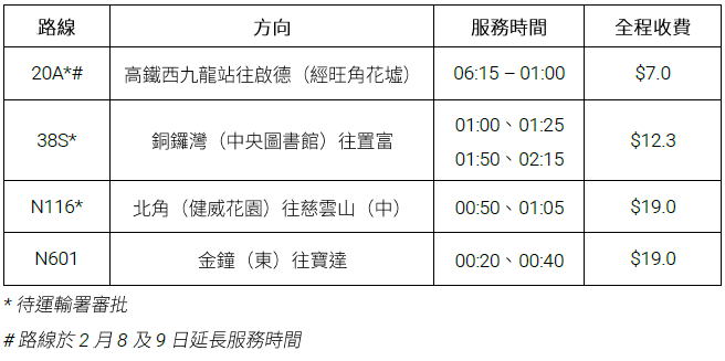 同时,城巴将于大除夕夜(2月9日)增设并加强多条市区路线服务,顾客不论享用团年饭夜归,或抓紧机会夜游年宵,都可以安心回家。下列城巴路线将于2月9日深夜提供服务或延长服务时间: