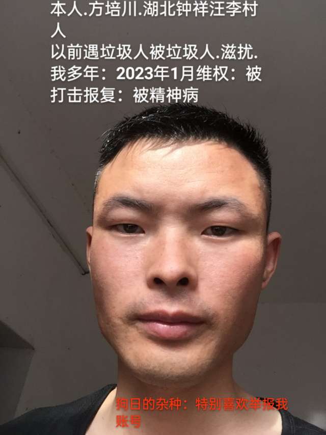 我叫方培川,男,生于1995年1月:家住钟祥市洋梓镇汪李村十组21号:联系方式:15572601930    15908650157维权讨公道:险些丧了命维权被精神病