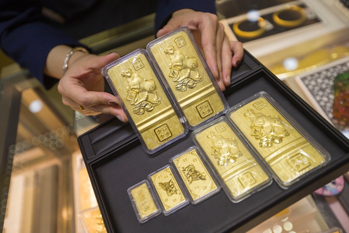 資料圖為某金店工作人員展示金條。  香港中通社圖片